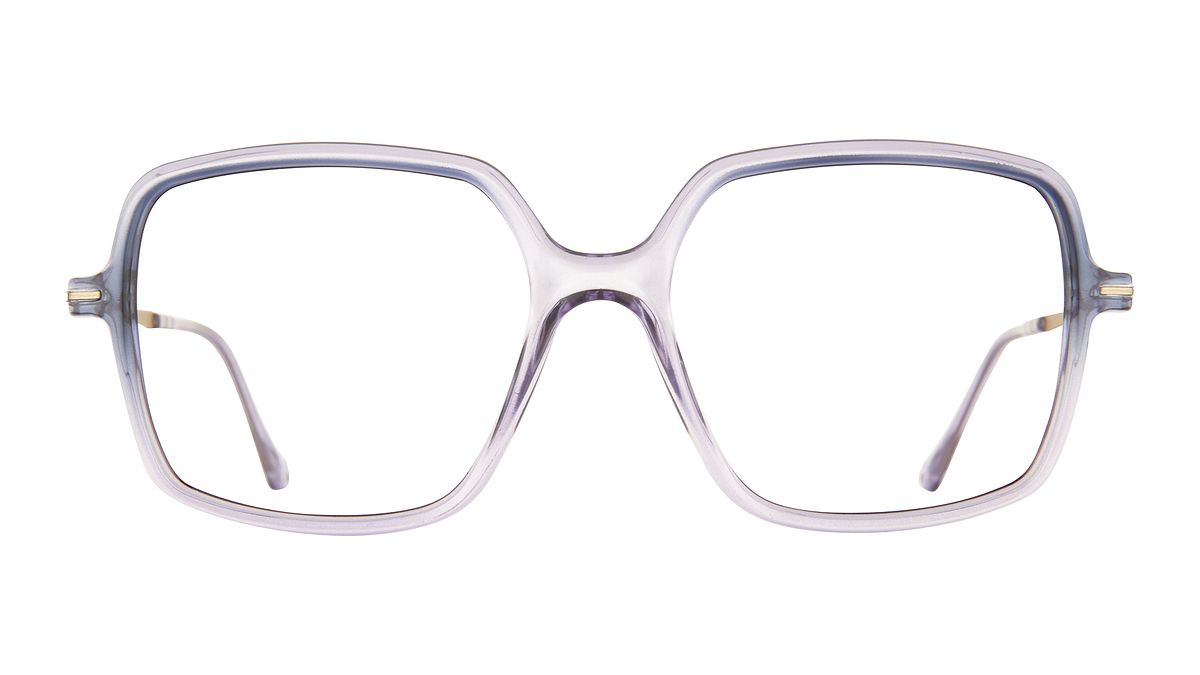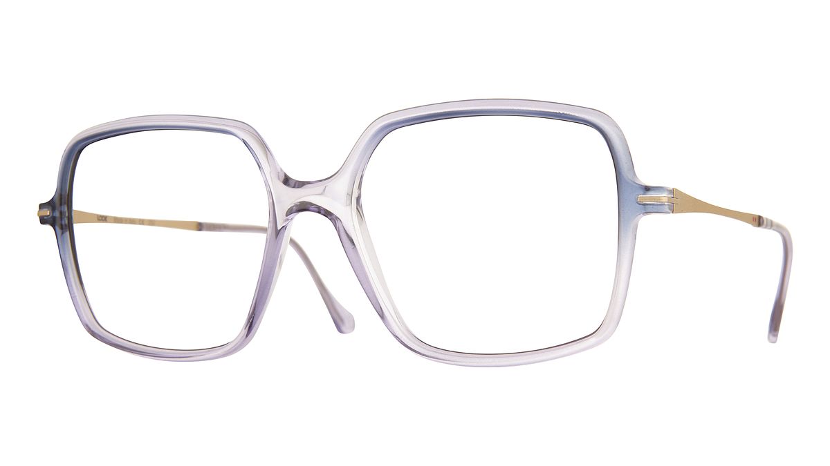 Farbe W3 - Transparente, glänzende Mittelteil mit violett-blauem Farbverlauf. Matte, hellgoldene Bügel. Passende Bügelenden.