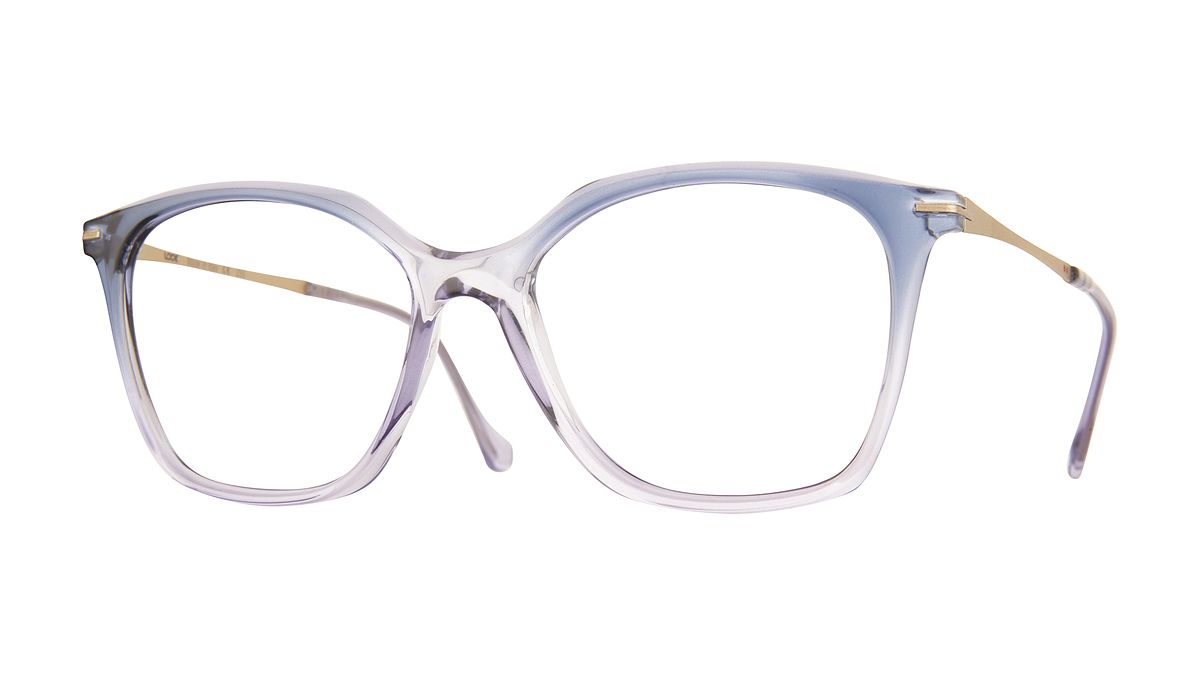Farbe W4 - Transparente, glänzende Mittelteil mit violett-blauem Farbverlauf. Matte, hellgoldene Bügel. Passende Bügelenden.