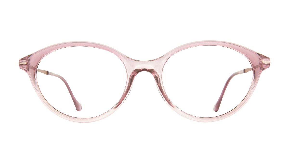 Farbe W2 - Transparentes, glänzendes Mittelteil in Pflaumenfarbe. Matte roségoldene Bügel. Passende Bügelenden.