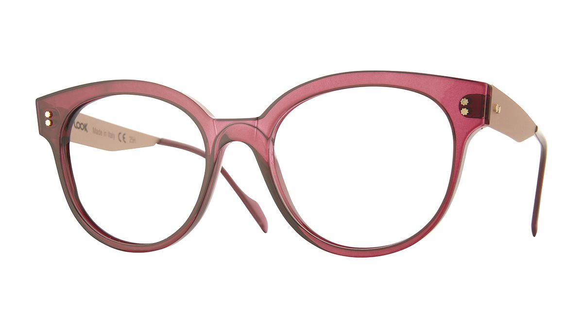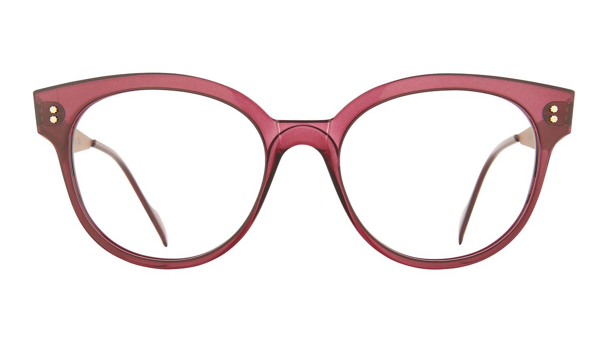 Farbe W2 - Transparente, glänzende burgunderrote Mittelteil. Metallische roségoldene Bügel. Passende Bügelenden.