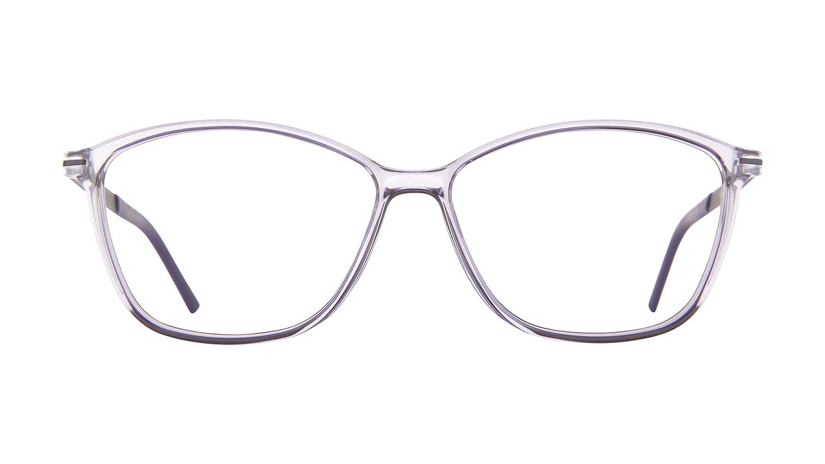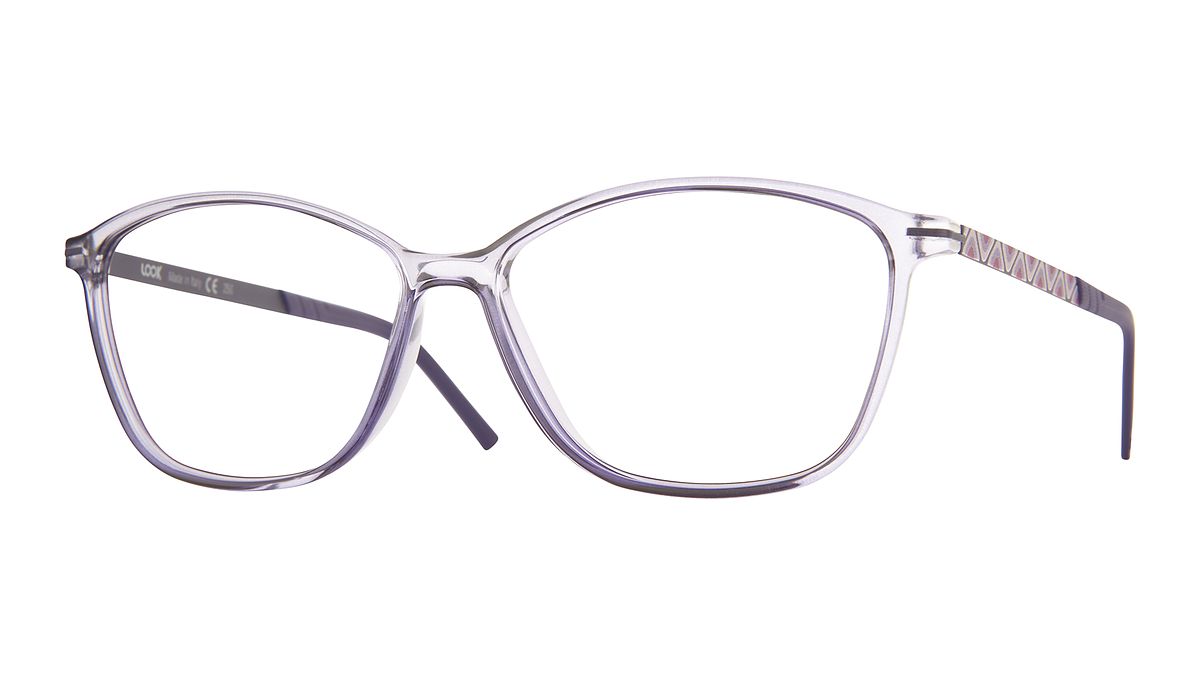 Colorazione W8 - Frontale genziana trasparente lucido. Aste con pattern blu/viola opaco. Terminale in abbinamento.