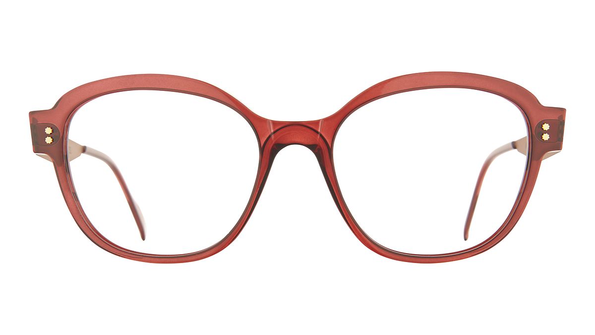 Colorazione W2 - Frontale bordeaux trasparente lucido. Aste oro rosa opaco. Terminale in abbinamento.