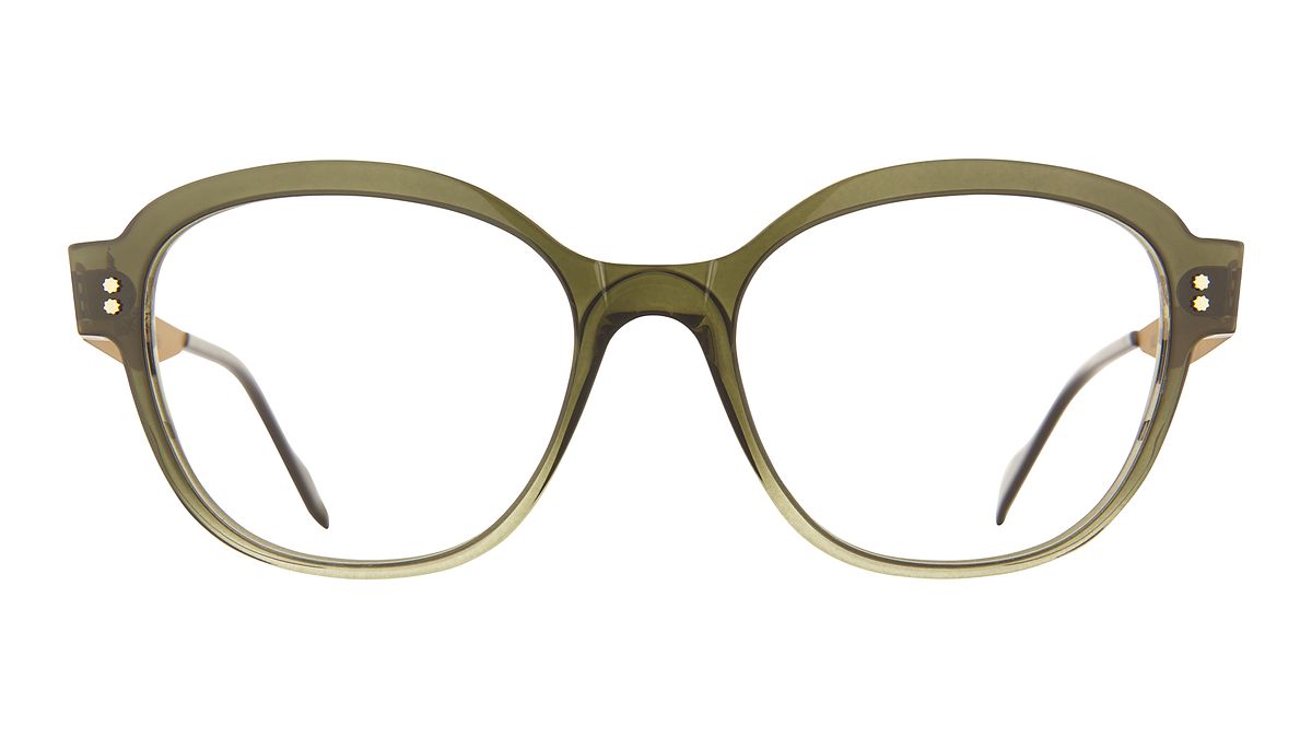 Colorazione W4 - Frontale verde trasparente lucido. Aste oro giallo opaco. Terminale in abbinamento.